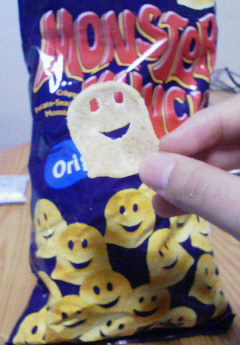 手に持ってる、チーズ味のモンスター型のポテトチップがいっぱい入ってる。
